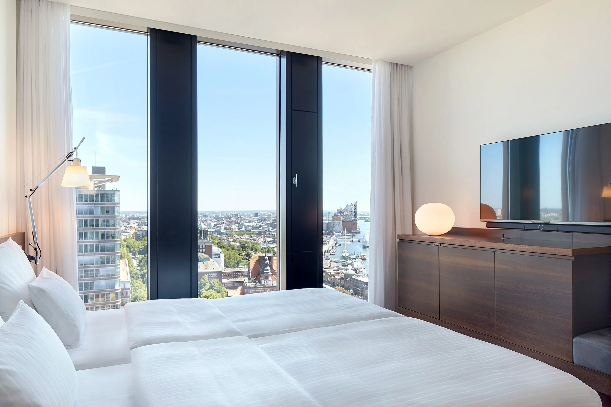 The Empire Riverside Hotel impresses with a spectacular panoramic view over Hamburg, the harbour and the Elbe. None other than the British star architect David Chipperfield designed the unique bronze tower, which rises into the sky as an integral part of Hamburg's harbour silhouette. 327 rooms and suites in a timelessly elegant ambience open up sensational views over Hamburg through panoramic glazing.